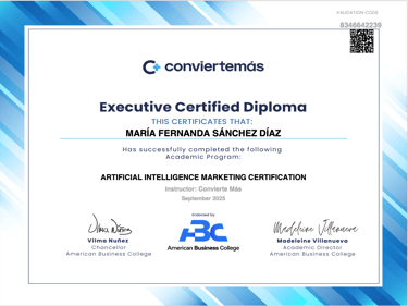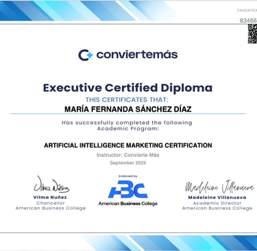 Certificada como Consultora por el CONOCER, así como en Artificial Intelligence Marketing por American Business College y en Análisis de Datos por Cisco.